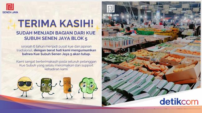"Terima kasih! Sudah menjadi bagian dari kue subuh Senen Jaya Blok 5. Setelah 6 tahun menjadi pusat kue dan jajanan tradisional, dengan berat hati kami mengumumkan bahwa Kue Subuh Senen Jaya 5 akan tutup," tulis akun @senenjayaofficial dikutip detikcom, Rabu (11/1/2023).
